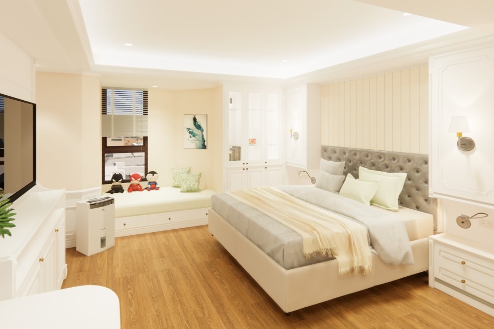 整體以米白與淺木地板為基調,結合高質感繃布床頭與閱讀臥榻,完美融合大人與孩子的生活需求。大量收納櫃體與展示櫃圍塑實用與美感兼具的氛圍,是家庭親密互動的理想選擇。