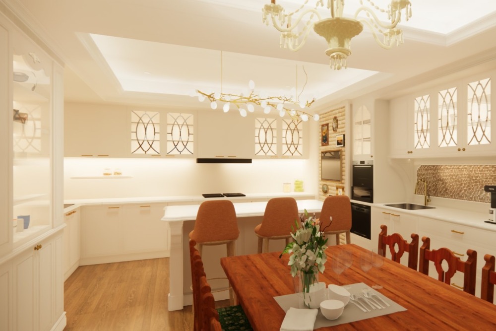 純白櫥櫃搭配復古玻璃門片與金色五金,細膩工藝展現優雅氣韻。中央吊燈與中島設計拉近料理與用餐之間的距離,讓每一餐都成為家的饗宴時光。