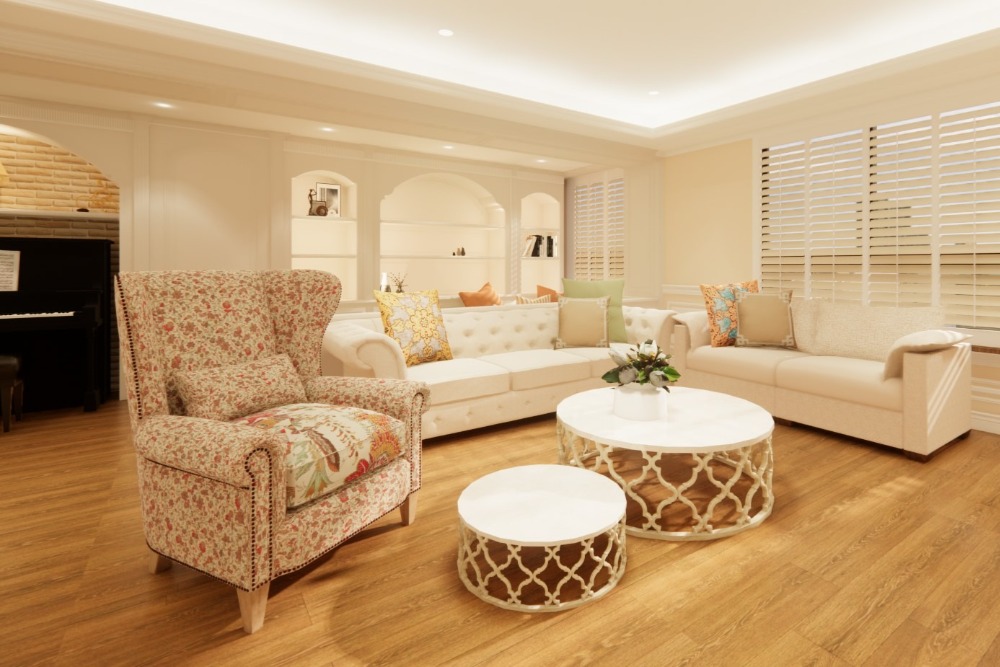 從優雅線板到異材混搭的家具配置,細膩描繪出溫柔而不失格調的起居空間。拱形層架與立體花磚壁爐區營造輕奢氛圍,搭配豐富軟裝與自然光影,讓客廳成為家的視覺亮點與情感核心。