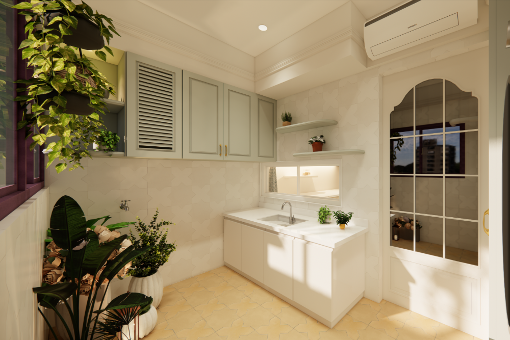 清新白色與莫蘭迪綠櫃體,搭配弧形玻璃門與多層綠植點綴,打造自然溫潤的工作陽台。兼具洗衣、水槽與收納功能,明亮而不壓迫,是都市生活中的自然綠洲。