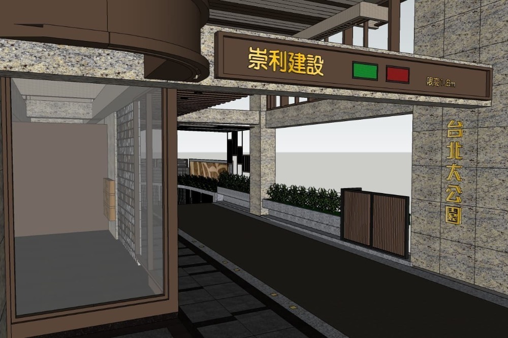入口立面以現代線條搭配石材質感打造,呈現簡約大氣的迎賓風格。社區名稱與建設公司標示清晰,結合車道限高顯示,兼具美觀與實用性,展現整體規劃用心。