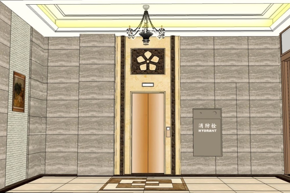 搭配對稱石材牆面與金色電梯門片,天花板以層次燈光與古典吊燈點綴,營造尊榮氛圍。牆上藝術裝飾與花形圖騰細節,處處展現對美學的用心,為回家的每一步增添儀式感。