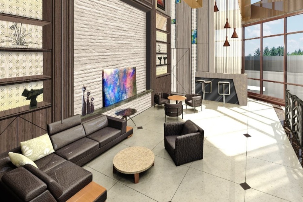 挑高設計結合大面玻璃窗,引入自然光線,塑造開闊明亮的社交空間。混搭藝術牆面、質感沙發與簡約吧台,構成具設計感的休憩場域,是接待賓客與住戶交流的理想場所。